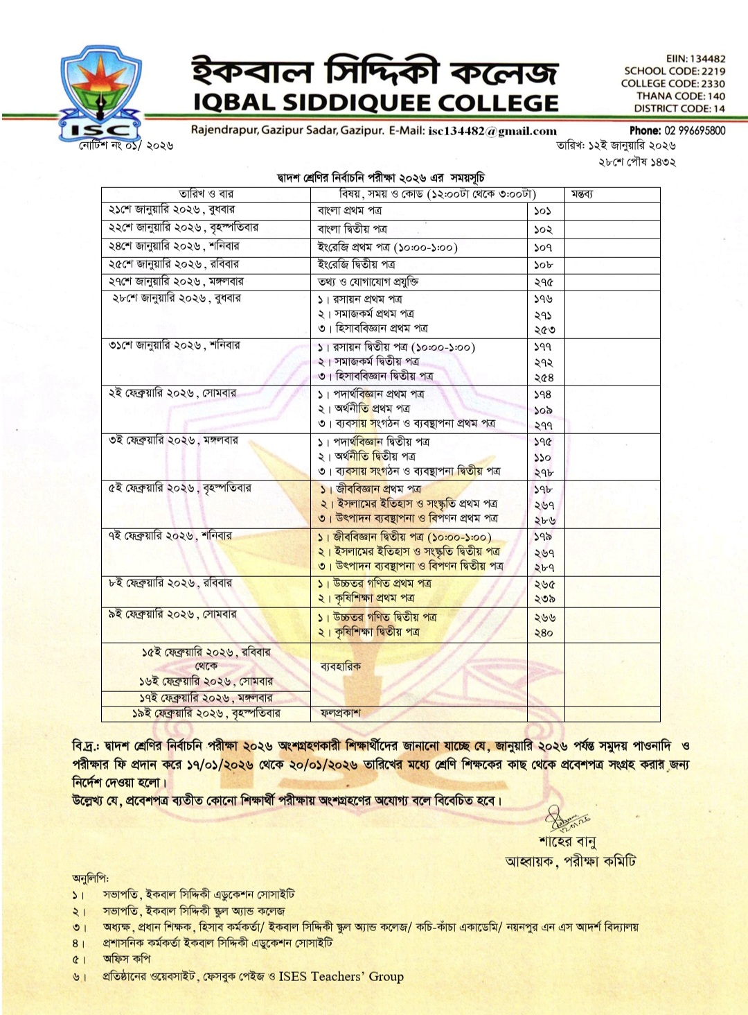*** দ্বাদশ শ্রেণির নির্বাচনি পরীক্ষা ২০২৬ এর সময়সূচি