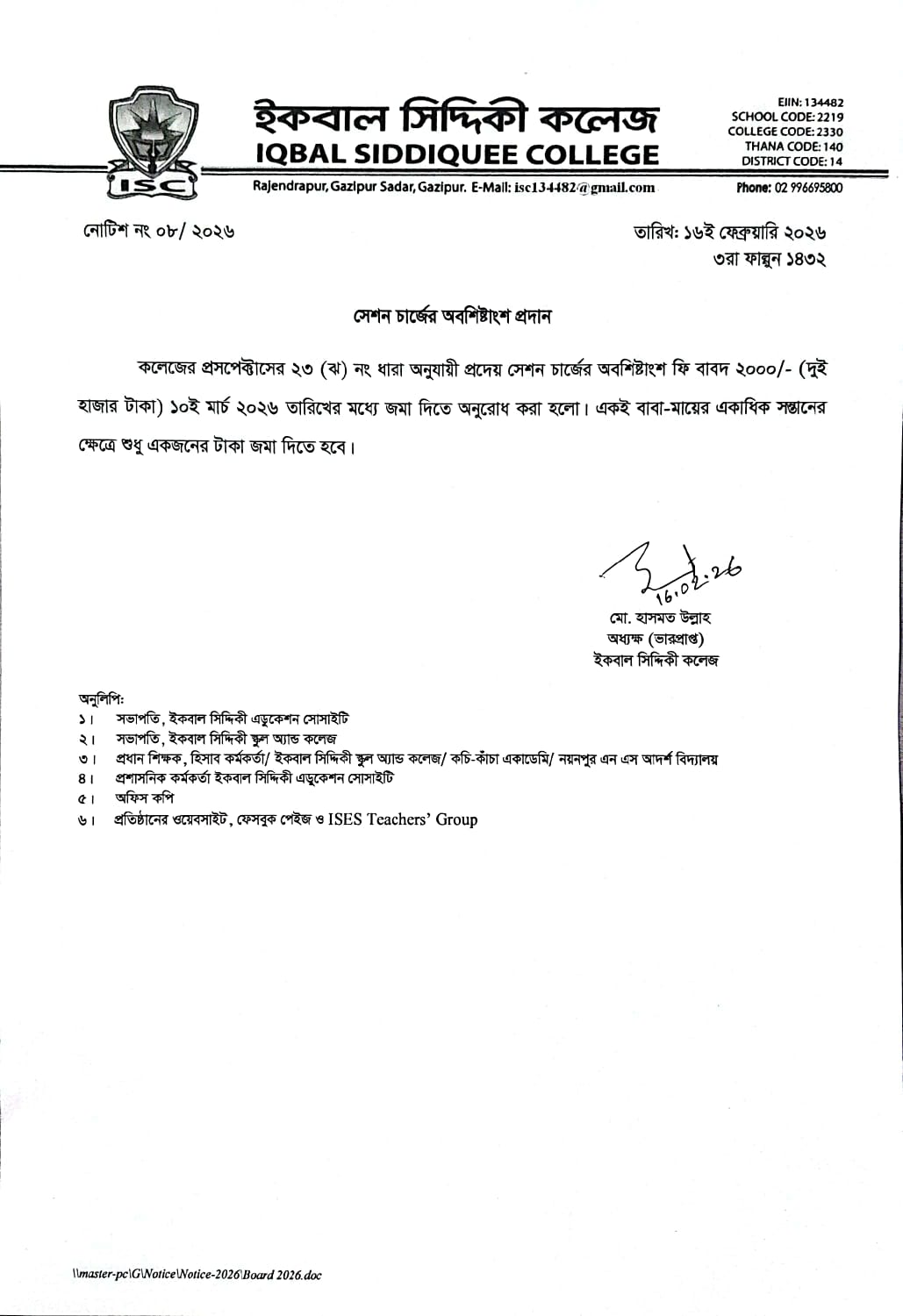 *** সেশন চর্জের অবশিষ্টাংশ প্রদান